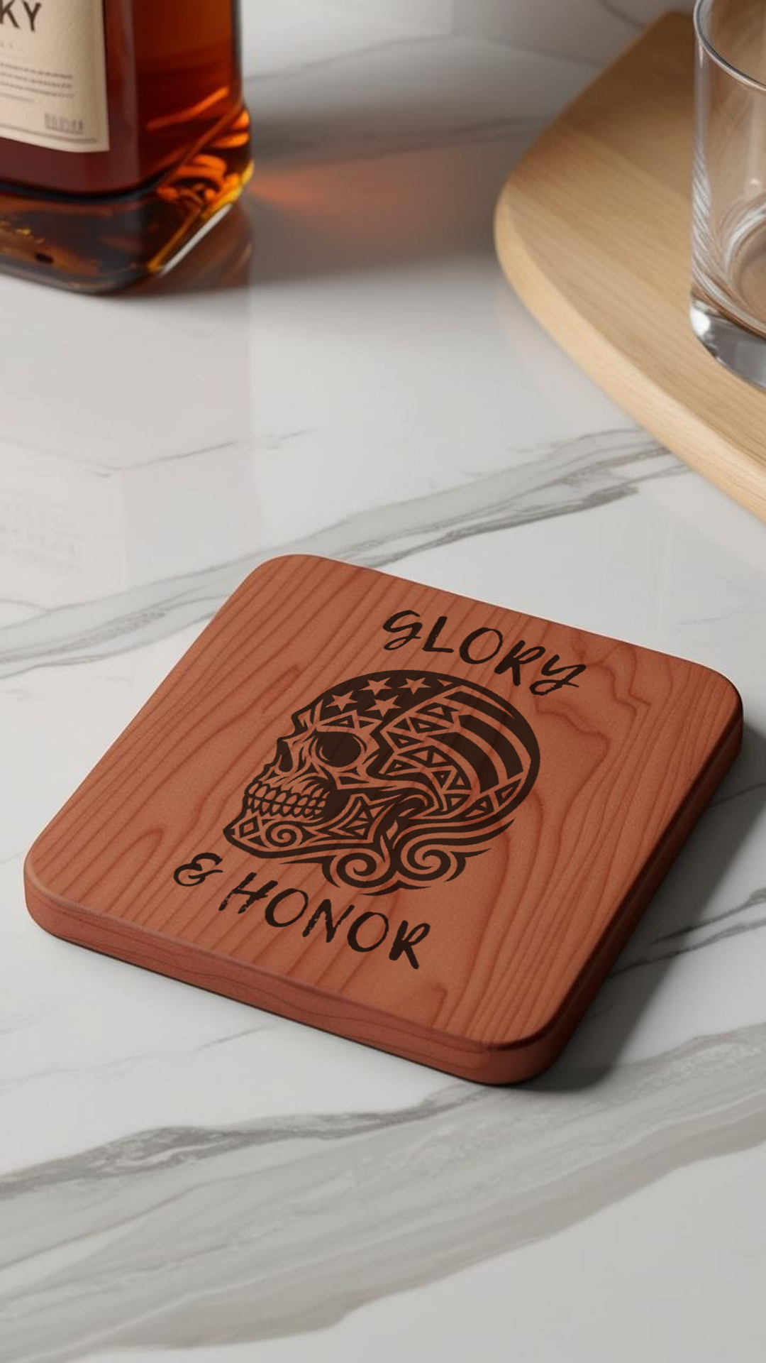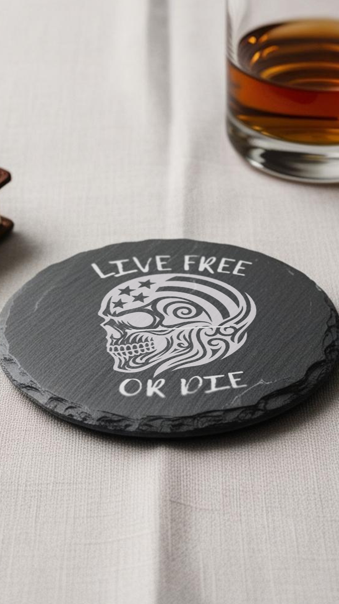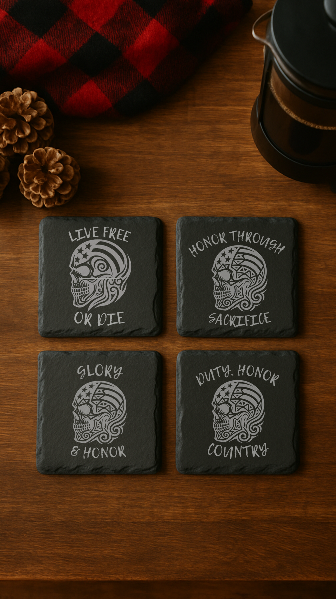Inject bold, high-contrast style into your space with our Patriotic Skull Coaster Collection, proudly designed and laser-engraved in Pennsylvania, USA. Each set of four striking coasters combines iconic skull motifs, and hard-hitting motivational phrases—perfect for anyone who wears their pride on their sleeve.