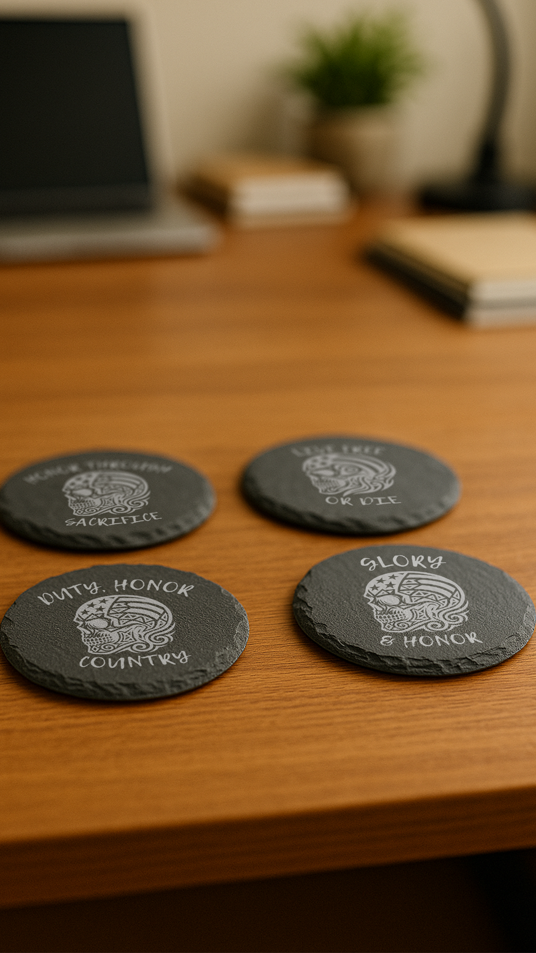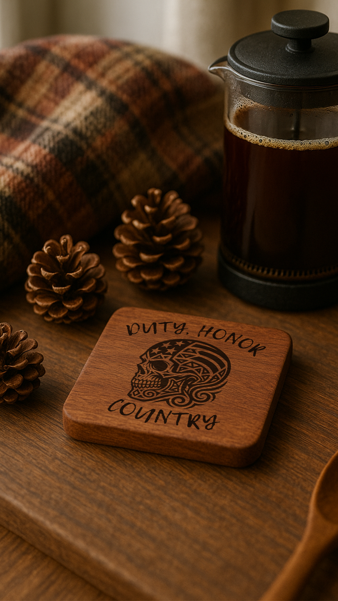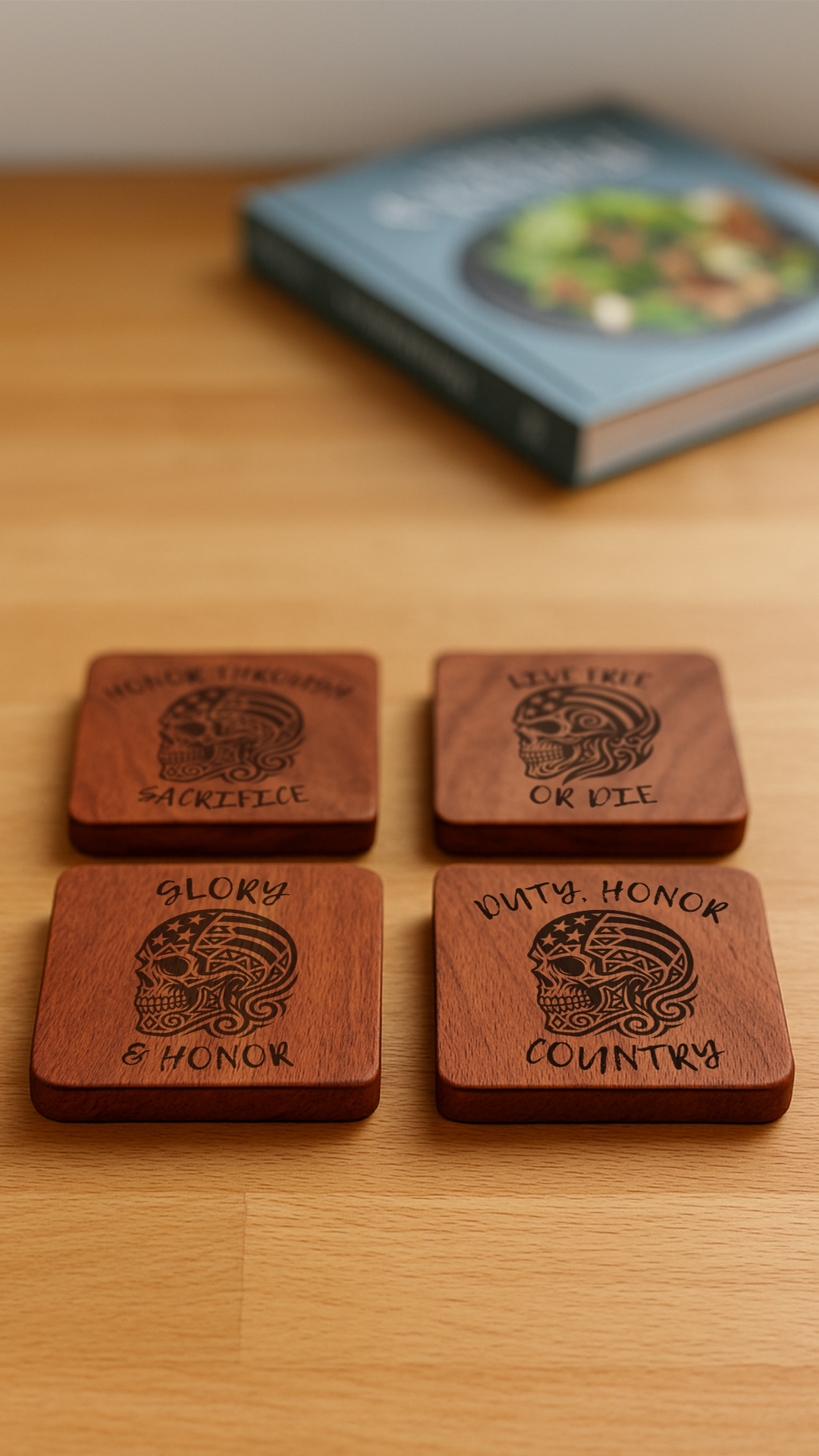 Inject bold, high-contrast style into your space with our Patriotic Skull Coaster Collection, proudly designed and laser-engraved in Pennsylvania, USA. Each set of four striking coasters combines iconic skull motifs, and hard-hitting motivational phrases—perfect for anyone who wears their pride on their sleeve.
