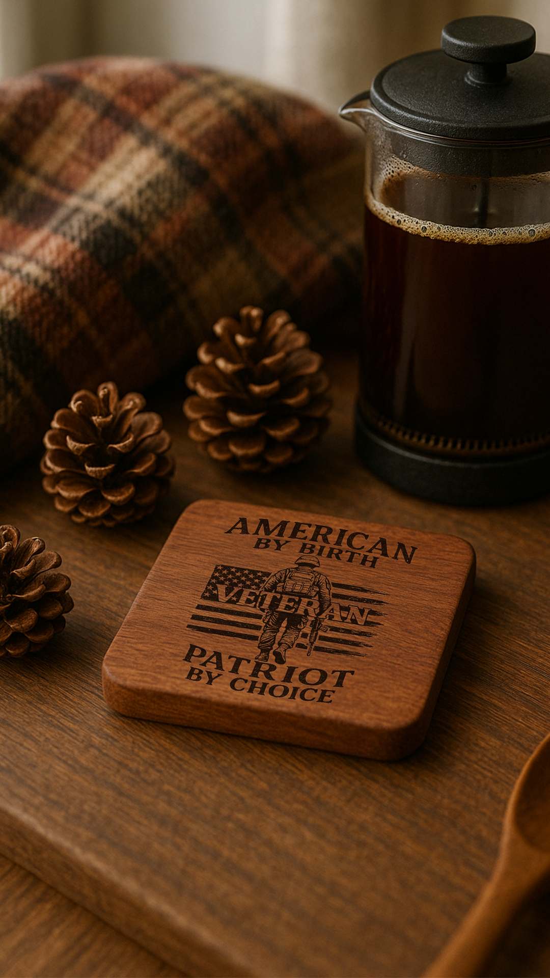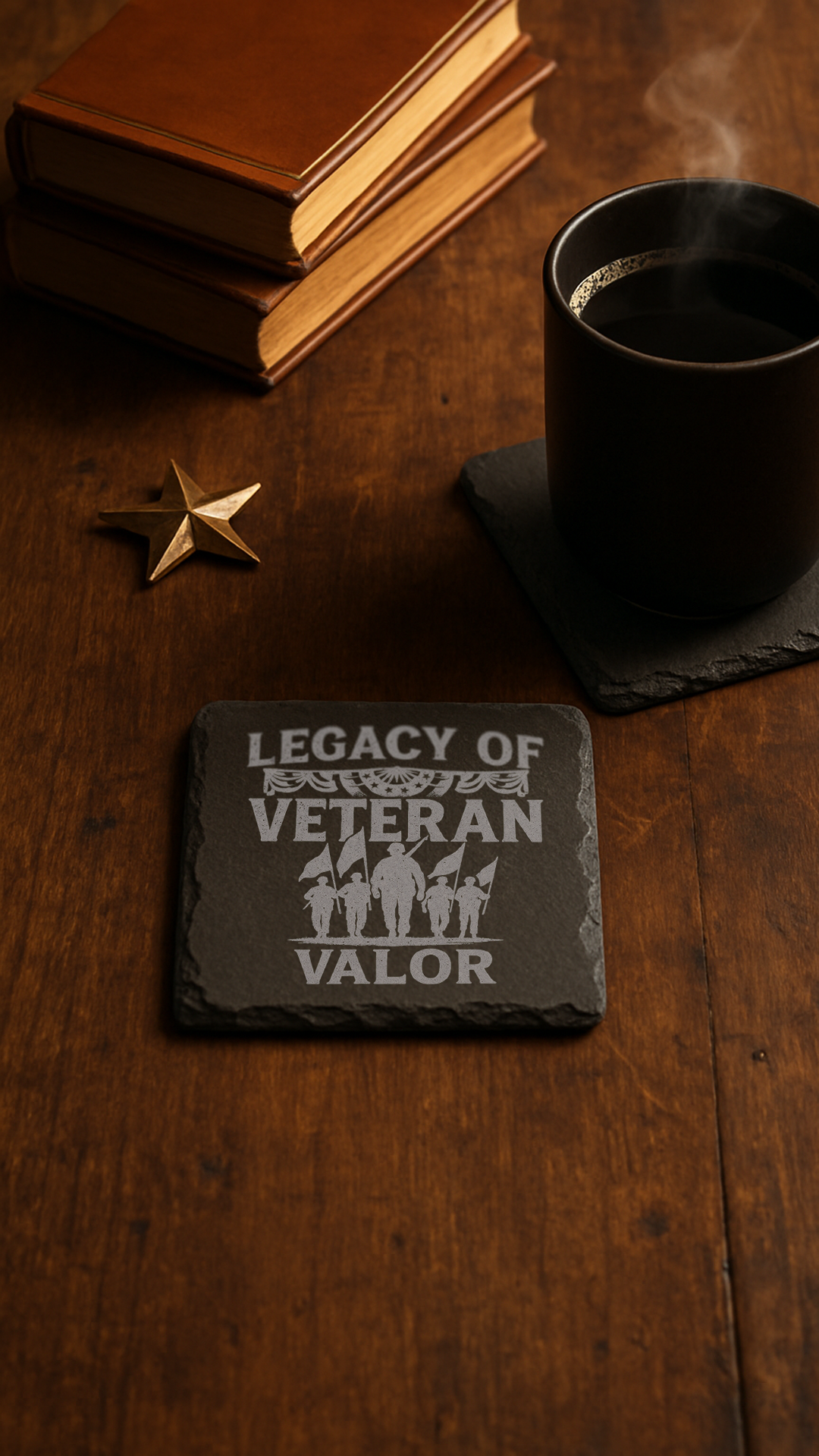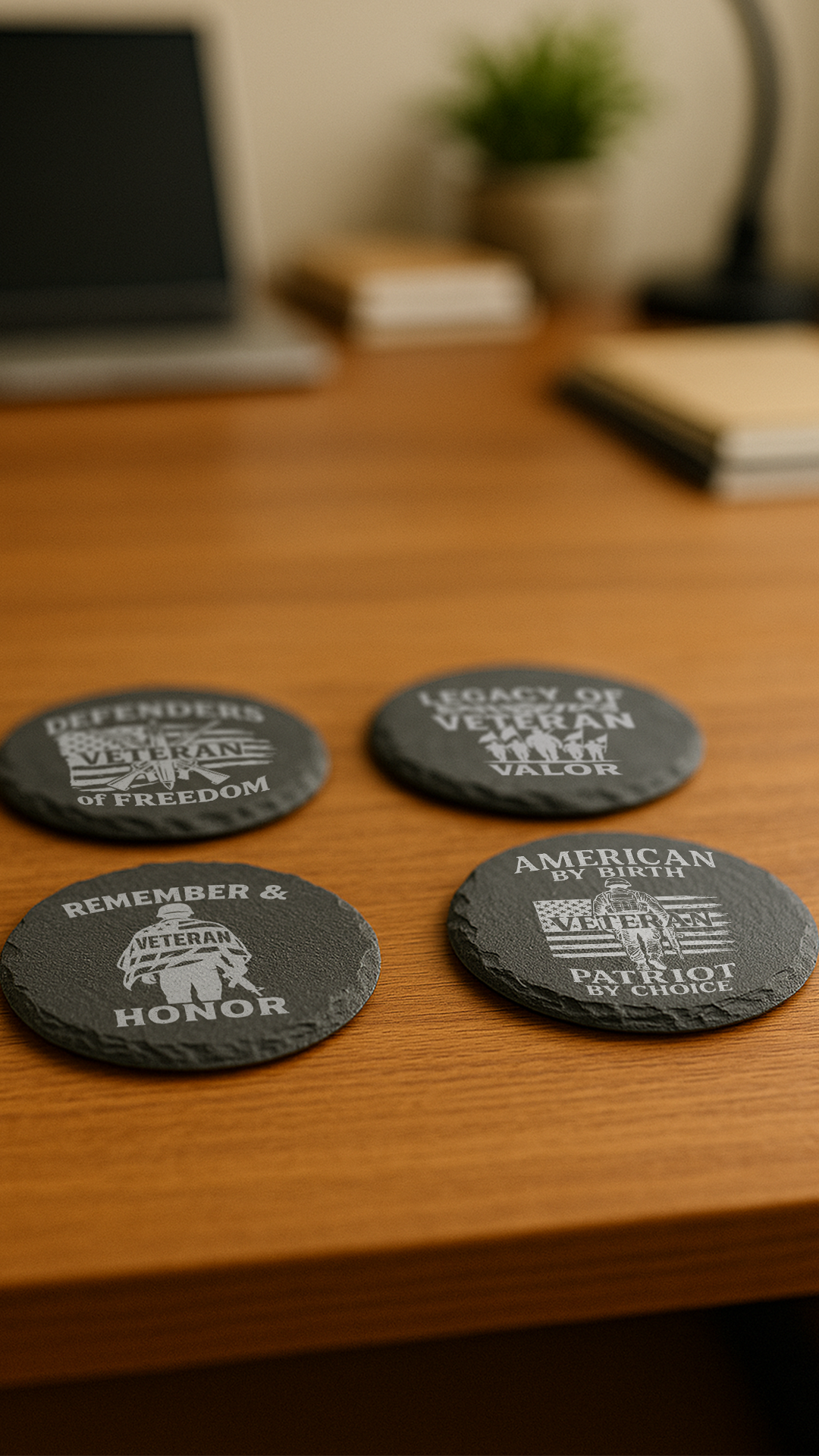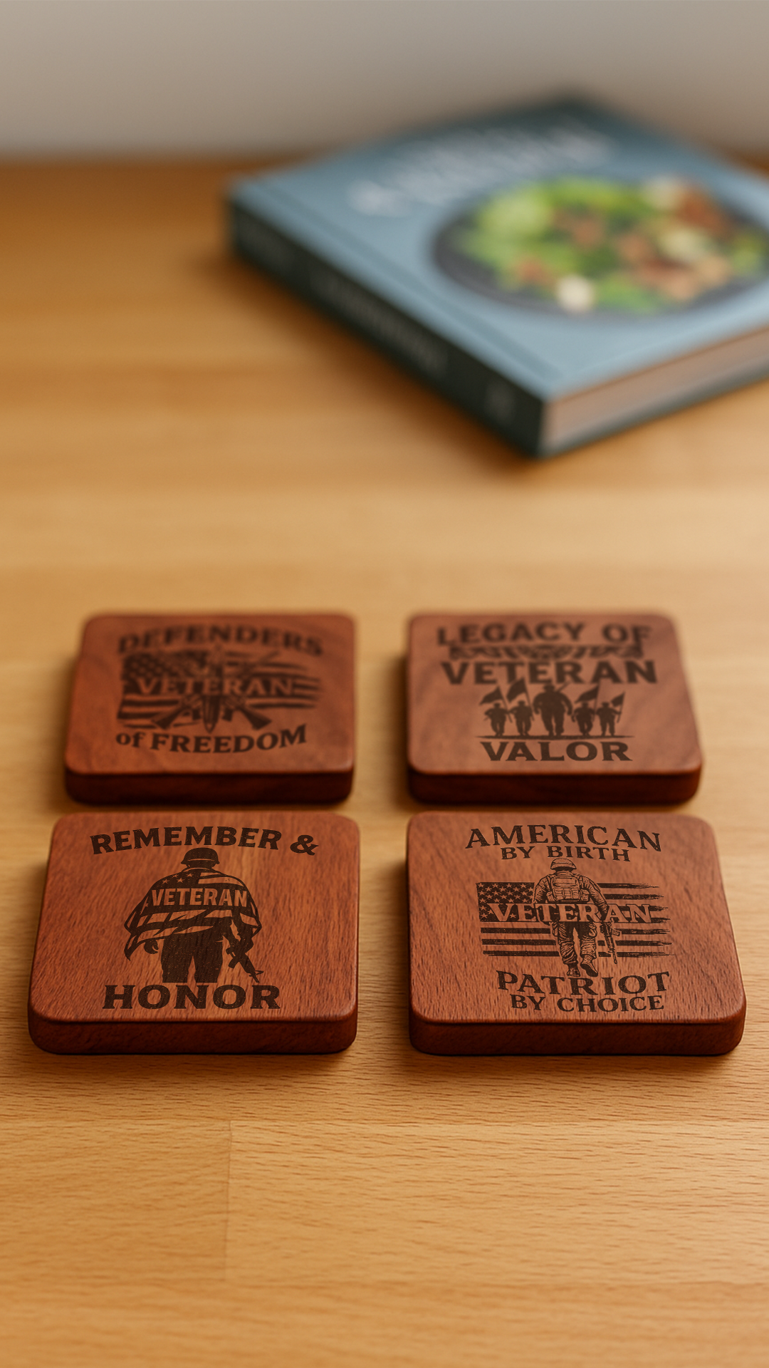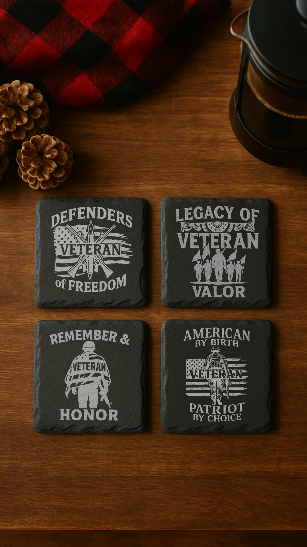 All designs feature veteran- and patriot-inspired imagery and text, laser-engraved for crisp, lasting detail. Your set also arrives with a sleek coaster holder—perfect for display and easy storage.
